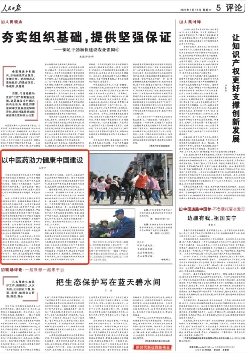 《人民日报》2023年1月18日05版 中医药学包括着中华民族几千年的康健养心理念及着实践履历,,,,,,是中华文明的一个瑰宝,,,,,,凝聚着中国人民和中华民族的广博智慧。。。。。。党的二十大报告提出:“增进中医药传承立异生长。。。。。。” 把中医药这一祖先留给我们的名贵财产继续好、生长好、使用好,,,,,,关于加速推进康健中国建设,,,,,,具有主要意义。。。。。。 现在,,,,,,人民群众多条理多样化康健需求一连快速增添,,,,,,康健越来越成为群众体贴的重大民生福祉问题。。。。。。各人不但要求看得上病、看得好病,,,,,,更希望不抱病、少抱病。。。。。。更好知足人民群众的康健需求,,,,,,中医治未病的奇异优势和主要作用不可或缺。。。。。。此前印发的《康健中国行动中医药康健增进专项运动实验计划》明确提出“在康健中国行动中进一步施展中医药作用”,,,,,,并作出详细安排。。。。。。充分验展中医药优势,,,,,,将中医治未病理念融入康健增进全历程、重大疾病防治全历程、疾病诊疗全历程,,,,,,必能更好地全方位全周期包管人民康健。。。。。。 中医药学以为,,,,,,人体自己是一个有机的整体;;;;;;;;其头脑方法不是简朴的非此即彼,,,,,,而是注重整体关联。。。。。。在疾病治疗历程中,,,,,,中医往往着眼于病因和病机,,,,,,一方面帮助正气,,,,,,提高自身免疫力,,,,,,另一方面祛除邪气,,,,,,将体内疫毒扫除出去,,,,,,实现“正气存内,,,,,,邪不可干”。。。。。。好比,,,,,,在抗击新冠疫情中获得普遍使用且疗效显著的清肺排毒汤,,,,,,既祛寒闭又利小便祛湿,,,,,,既防疫邪入里,,,,,,又调肝和胃,,,,,,顾护消化功效。。。。。。这其中,,,,,,正蕴含着中医治疗学协调阴阳的理念。。。。。。健全中医药服务系统,,,,,,充分验展中医药在康健服务中的作用,,,,,,既是推动中医药高质量生长的内在要求,,,,,,也是包管人民康健的题中应有之义。。。。。。 建设康健中国,,,,,,要关注治已病,,,,,,更要关注治未病。。。。。。起劲使群众不生病、少生病,,,,,,必需把预防为主摆在越发突出位置,,,,,,起劲推动从以治病为中心向以人民康健为中心转变。。。。。。治未病是中医药优势和特色的主要体现。。。。。。中医药提倡“预防为先”,,,,,,融预防保健、疾病治疗和康复为一体。。。。。。鼎力大举生长中医医疗服务,,,,,,加大中医医疗服务系统建设,,,,,,既有助于让宽大群众就近享受预防、保健、康复等中医药服务,,,,,,也能更好指导人们养成康健文明的生涯方法,,,,,,做好自身康健的第一责任人,,,,,,推进康健中国建设人人加入、人人尽责、人人共享。。。。。。 习近平总书记指出:“要做好守正立异、传承生长事情,,,,,,起劲推进中医药科研和立异,,,,,,注重用现代科学解读中医药学原理,,,,,,推动古板中医药和现代科学相团结、相增进,,,,,,推动中西医药相互增补、协调生长,,,,,,为人民群众提供越发优质的康健服务。。。。。。”抗疫实践,,,,,,让我们越发深刻熟悉到了中医药的奇异优势。。。。。。坚持以人民康健为中心,,,,,,坚持中西医团结、中西药并用,,,,,,建设切合中医药特点的服务系统、服务模式、管理模式、人才作育模式,,,,,,我们必能使古板中医药发挥光大,,,,,,为康健中国提供坚实支持。。。。。。